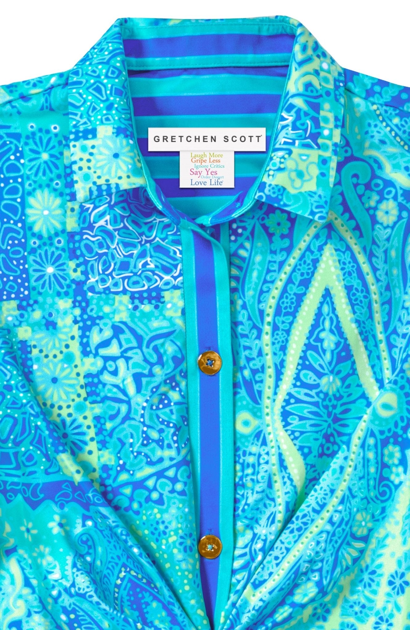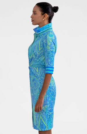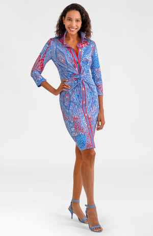 Bold print, flattering shape, and just the right amount of drama—this stretch-jersey dress was made to be noticed. The cinched waist and polished gold buttons add structure, while the vibrant Grand Bazaar pattern brings personality to workdays, dinners, and everything after.