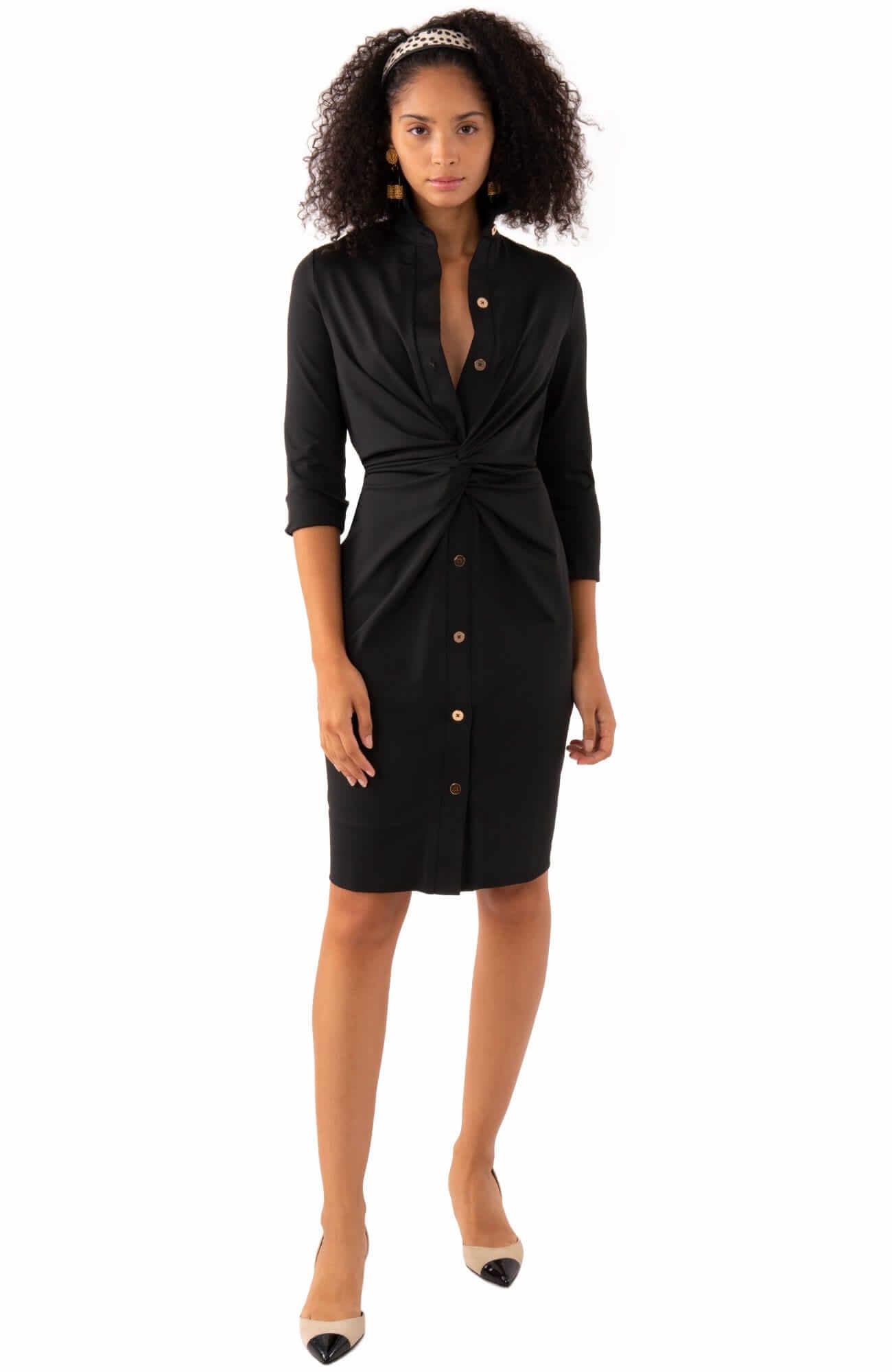 Some dresses just make getting dressed easy. This one does it with a flattering cinched waist, polished gold buttons, and soft stretch fabric that moves with you. Clean, classic, and endlessly versatile, it’s ready for office days, dinners out, and everything in between.