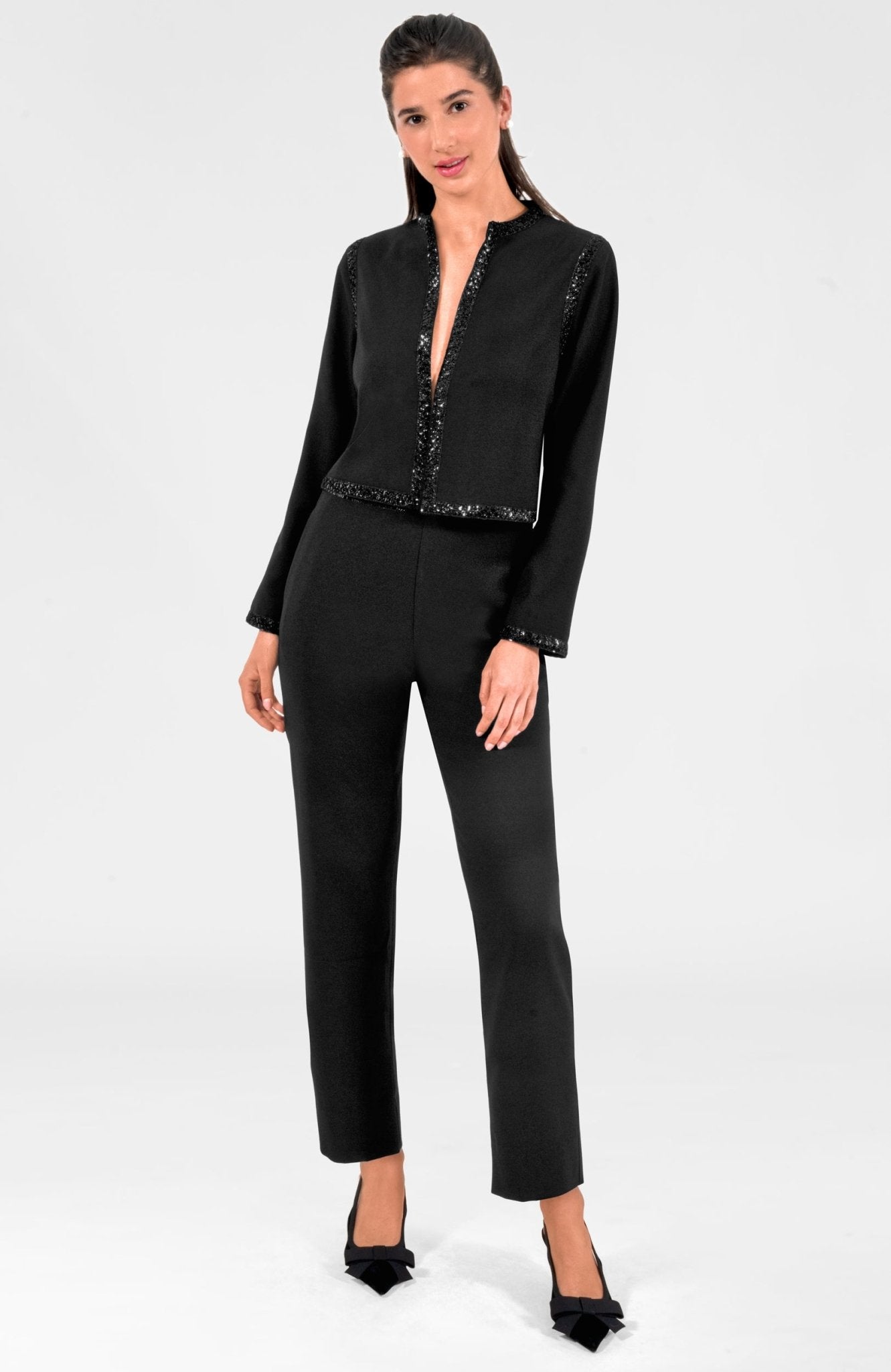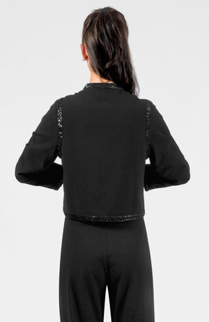 - Sequin Trim: Front Placket/Sleeves/ Waist